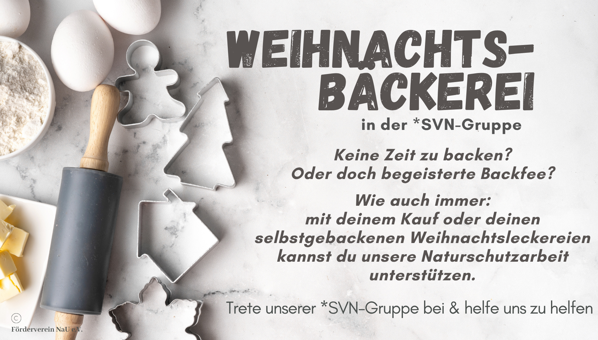 Bei den Einen wird in der Vor-/Weihnachtszeit viel gebacken, bei Anderen bleibt kaum Zeit. SVN-Gruppenmitglieder spenden ihre liebevoll, gebackenen Weihnachtsleckereien an andere Gruppenmitglieder. Der Erlös wird genutzt um Naturschützer finanziell/materiell zu unterstützen.